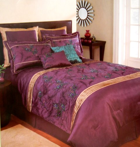 Gorgeous 8 piece purple plum comforter set with colorful peacock feathers embroidery Cmes with 2 standard shams 2 Euro shams 1 bedskirt 2 decorative pillows and comforter Dress up your bedroom or guest bedroom with a dramatic purple and colorful peacock feather on this comforter Sateen finis